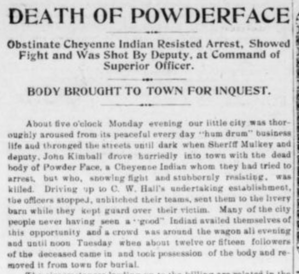 The old Arapaho Powderface had been named a “Chief” by the Federal Government, one of a few tribal headmen to treat with and later ignore. The newspaper called him “obstinate,” and it cost him his life. And the story was soon forgotten, how the “Chief” had been shot by a Dewey County Deputy while resisting arrest, left in the yellowing pages of old newspapers in an archive in Oklahoma City. Except for the memory of a little girl, Mona Violet, who had taken the opportunity to see a “real Indian” as Powderface’s body lay in wait for a Coroner’s Inquest in her sleepy little town.